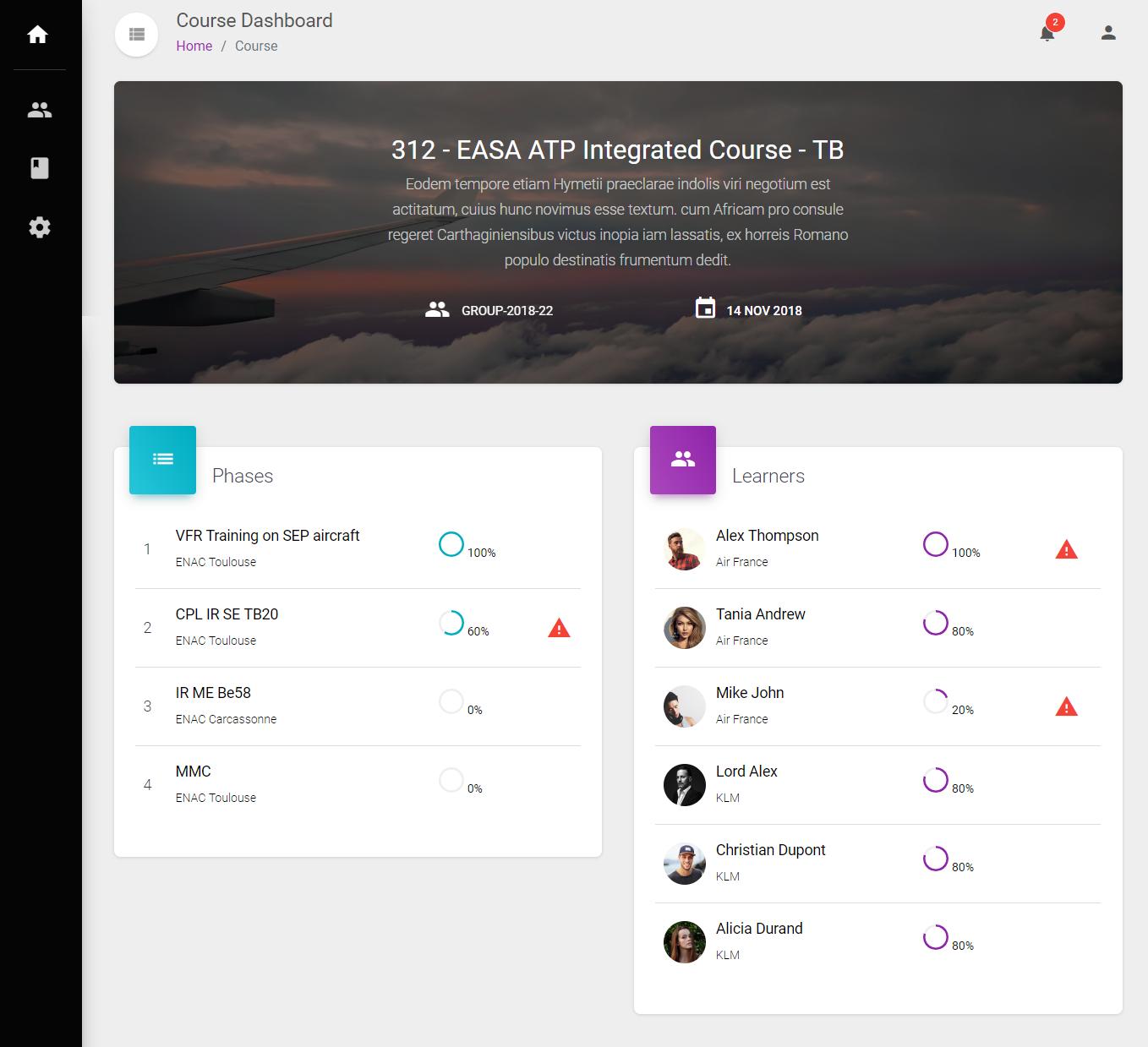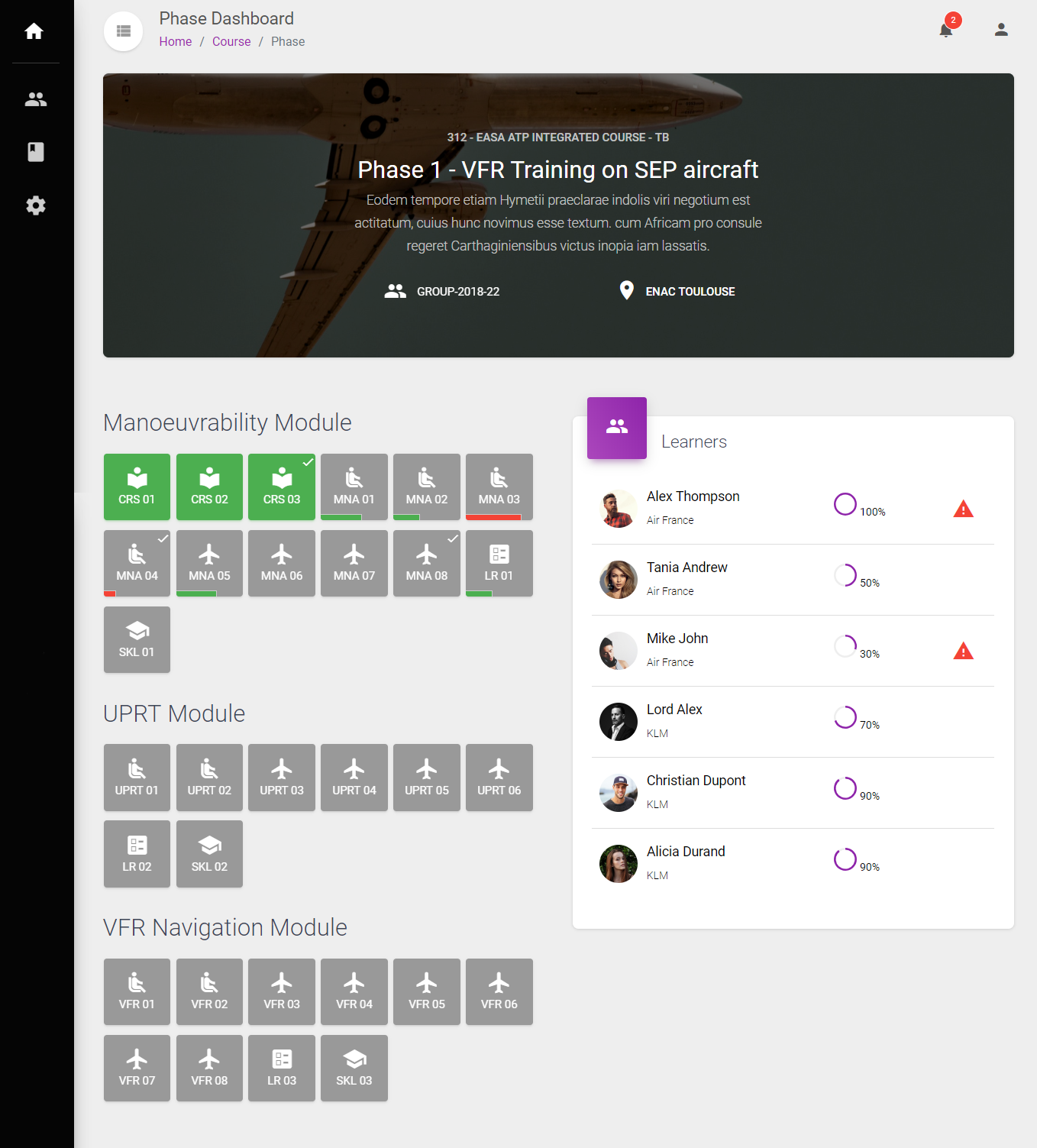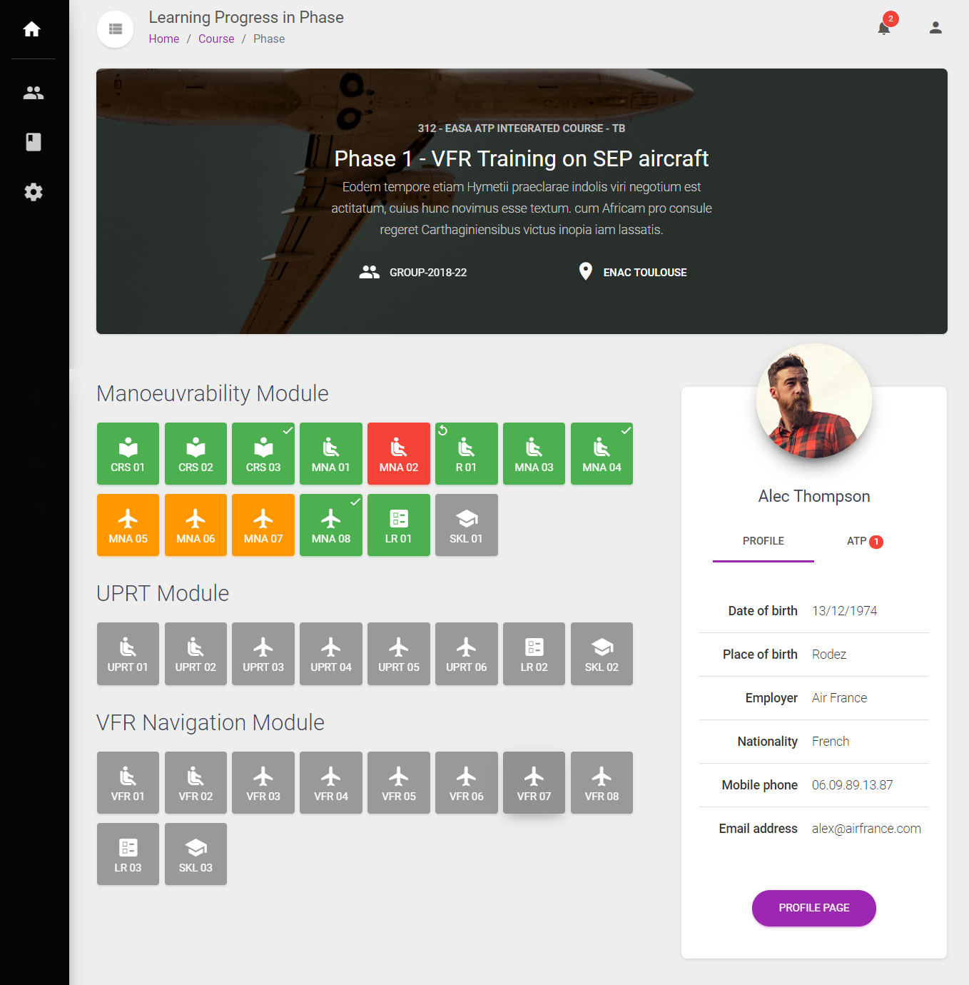 - Supporter des procédures pédagogiques qui mobilisent plusieurs acteurs impliqués dans le suivi de l’élève : instructeurs, responsables pédagogiques, responsables logistique, l’élève lui-même, son manager au sein de sa compagnie aérienne, etc.