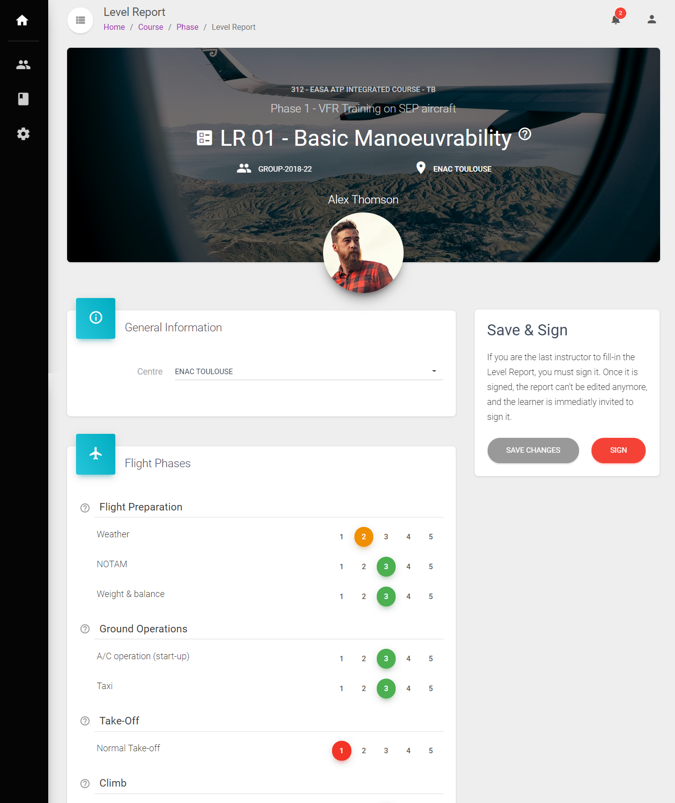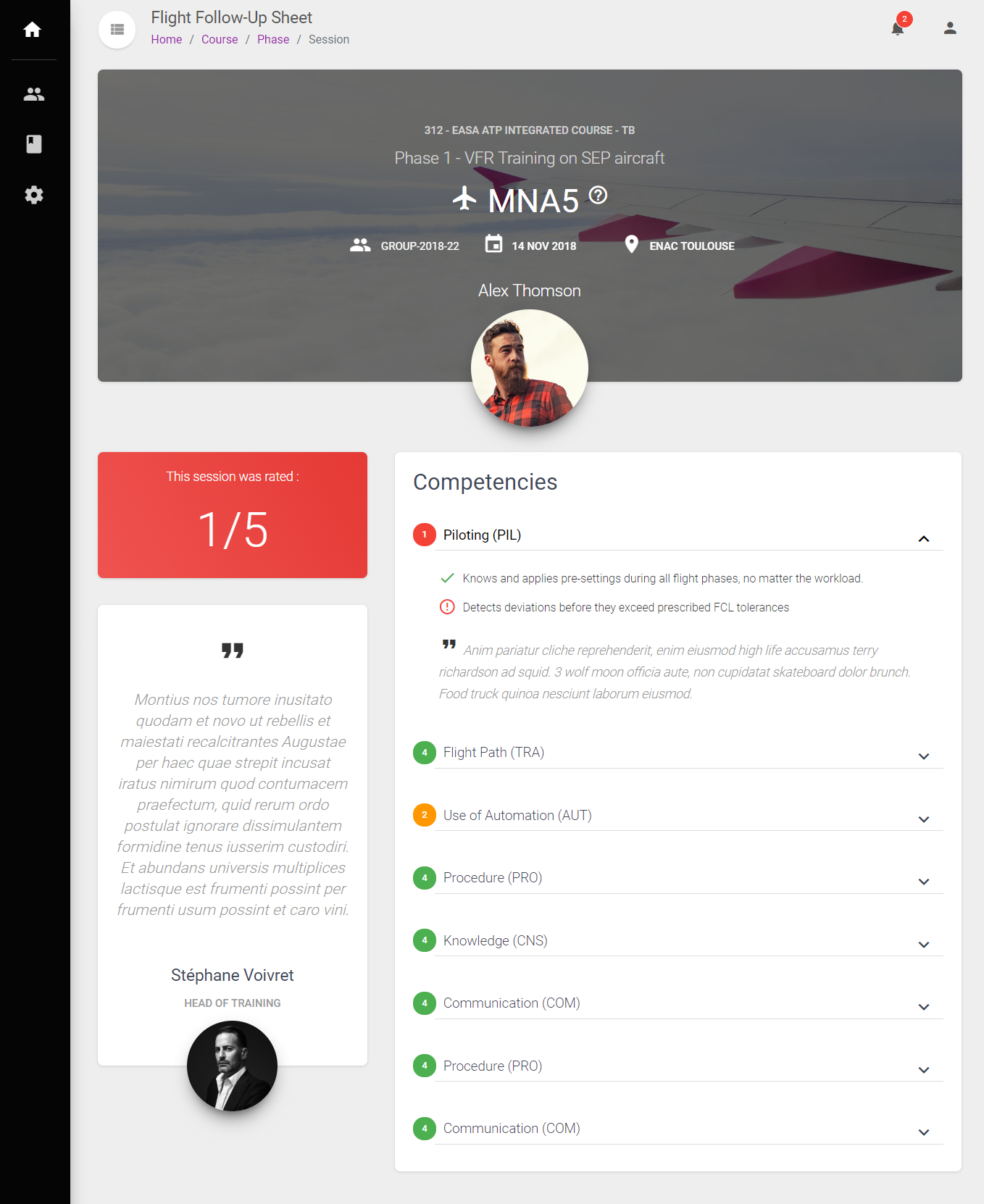 - Encourager la saisie de données qualitatives par les instructeurs, notamment des observations liées au comportement de l’élève, ainsi que des éléments d’évaluation alignés sur des référentiels de compétences aéronautiques.
